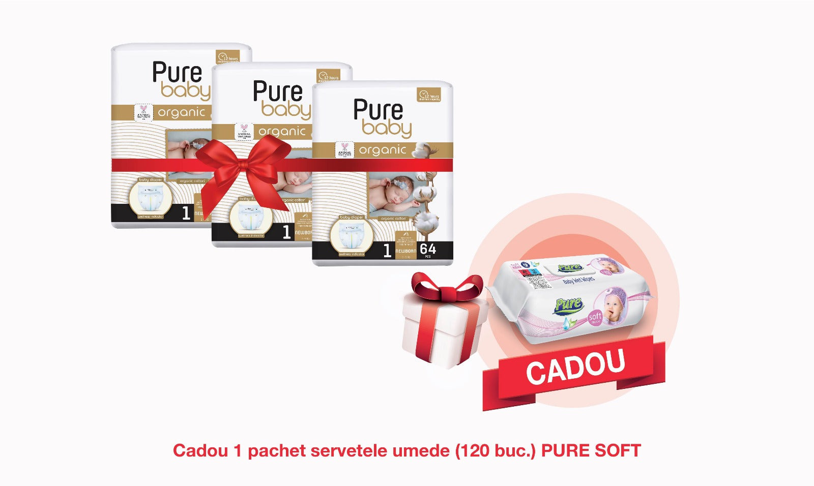 Pachet Promo: 3x PURE BABY Organic (1 NEWBORN) + CADOU Servetele Umede Pure Soft (120 buc.)