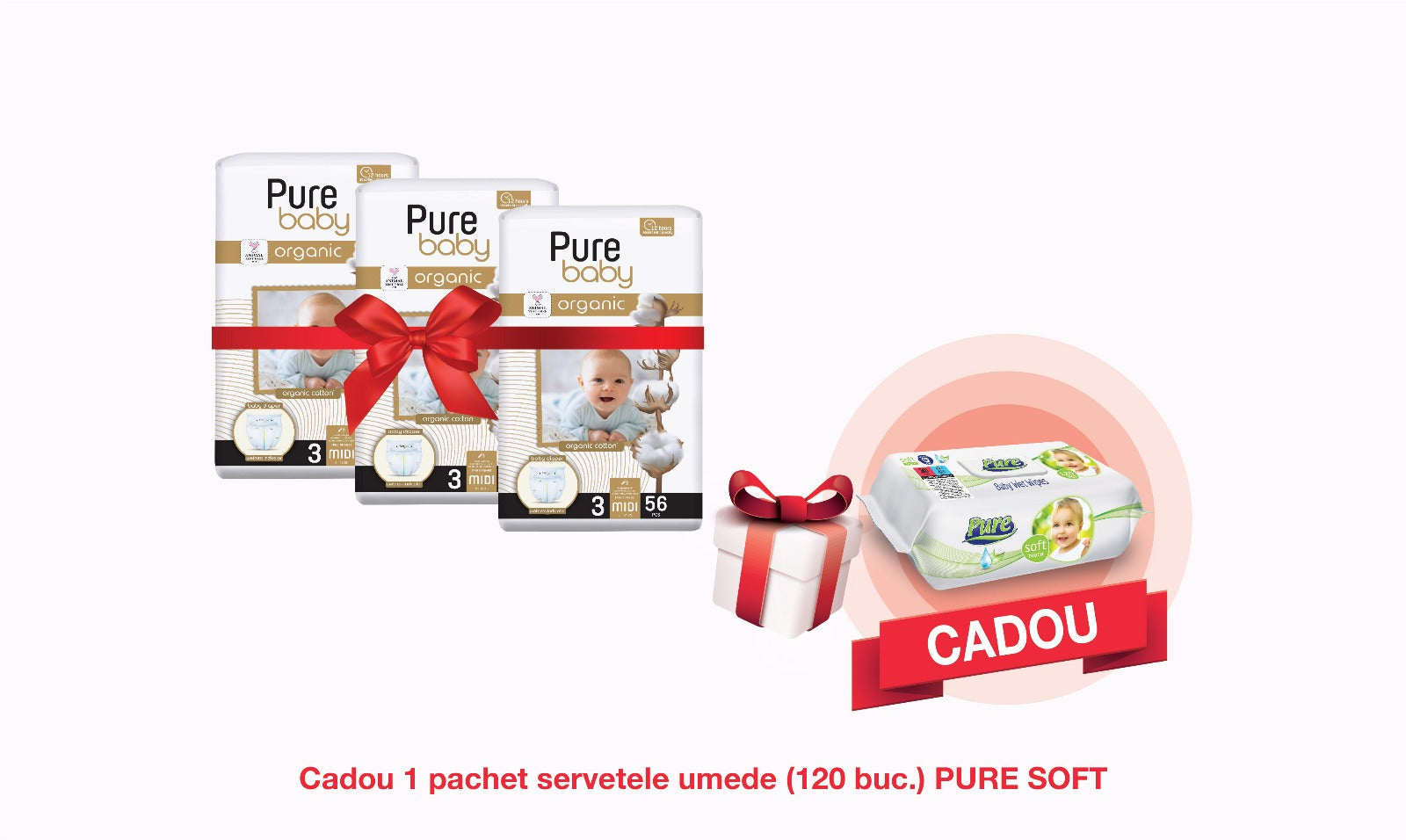 Pachet Promo: 3x PURE BABY Organic (3 MIDI) + CADOU Servetele Umede Pure Soft (120 buc.)