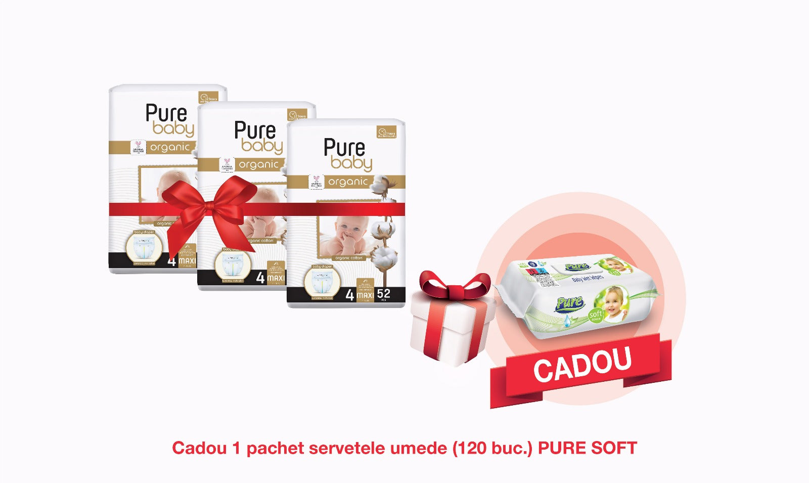 Pachet Promo: 3x PURE BABY Organic (4 MAXI) + CADOU Servetele Umede Pure Soft (120 buc.)