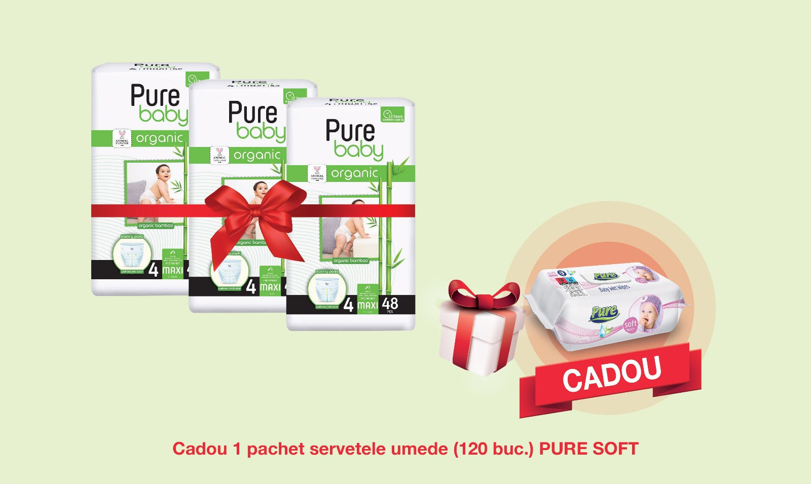 Pachet Promo: 3x Scutece PURE BABY Organic Bamboo (4 MAXI) + CADOU Servetele Umede Pure Soft (120 buc.)