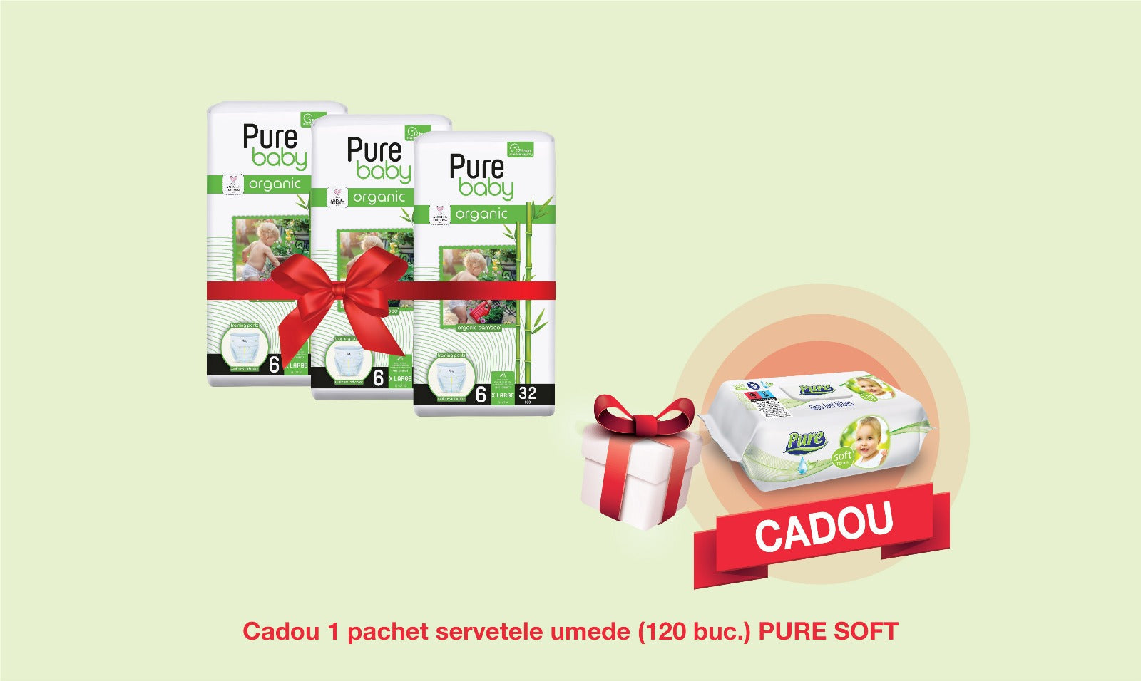 Pachet Promo: 3x PURE BABY Organic Bamboo (6 X LARGE) + CADOU Servetele Umede Pure Soft (120 buc.)